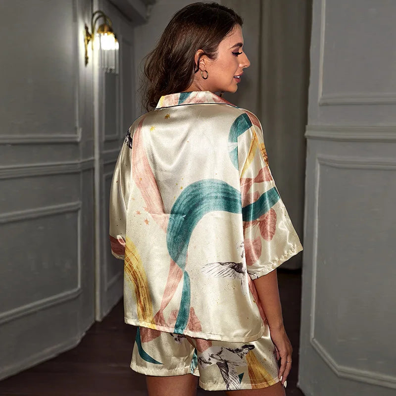 2025 Summer Satin Pajamas Set Women Sleepwear Flower Print Silk Pajama Femme Short Sleeve Loungewear Home Pajama Two Piece Suit