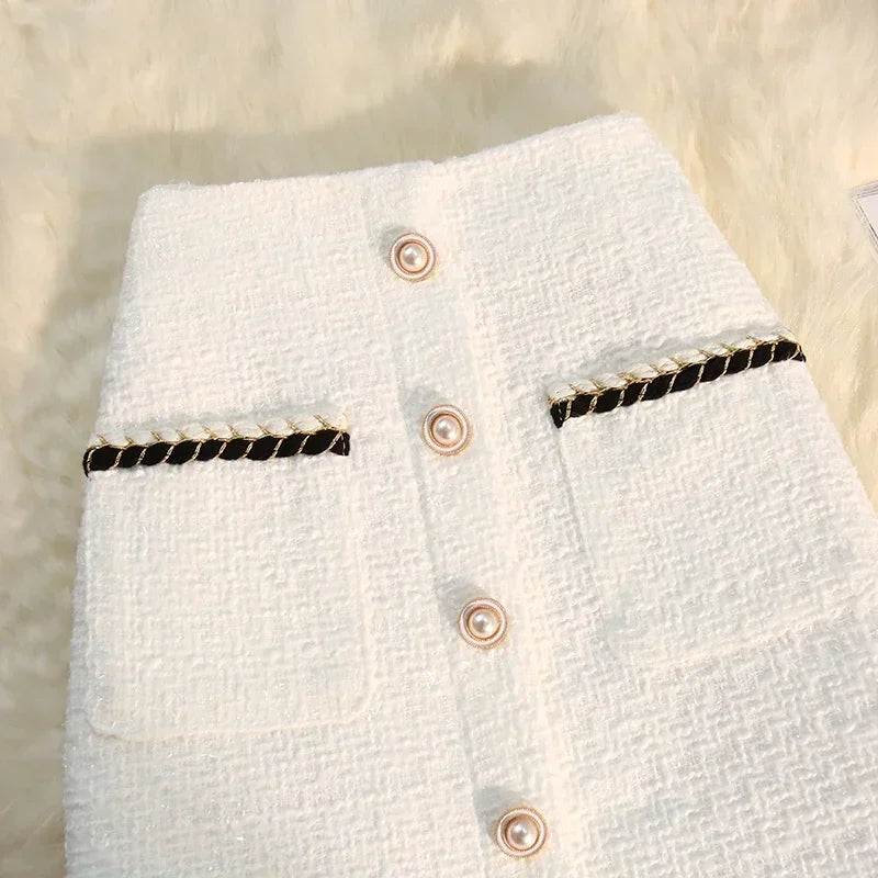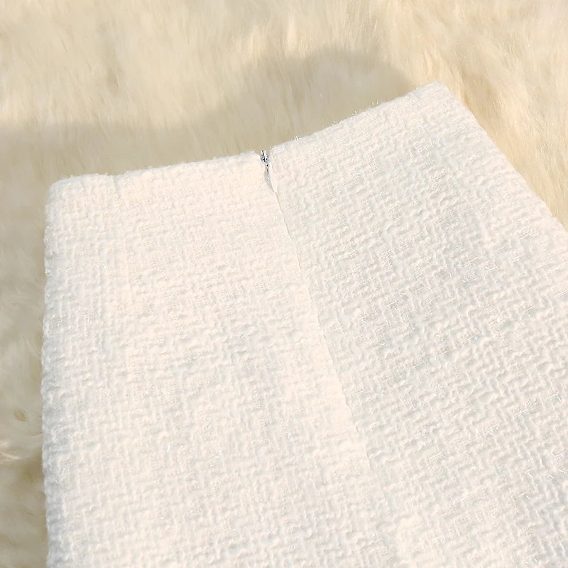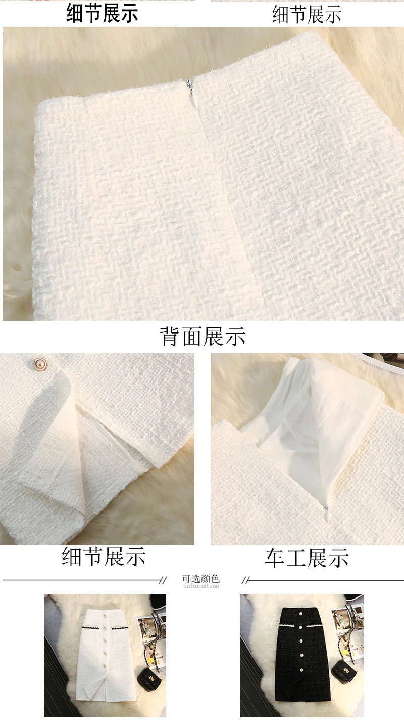 Black White Tweed Long Skirts Women Autumn Winter New Bright Silk Skirt Female Vintage High Waist A-line Wrap Skirt Office Lady